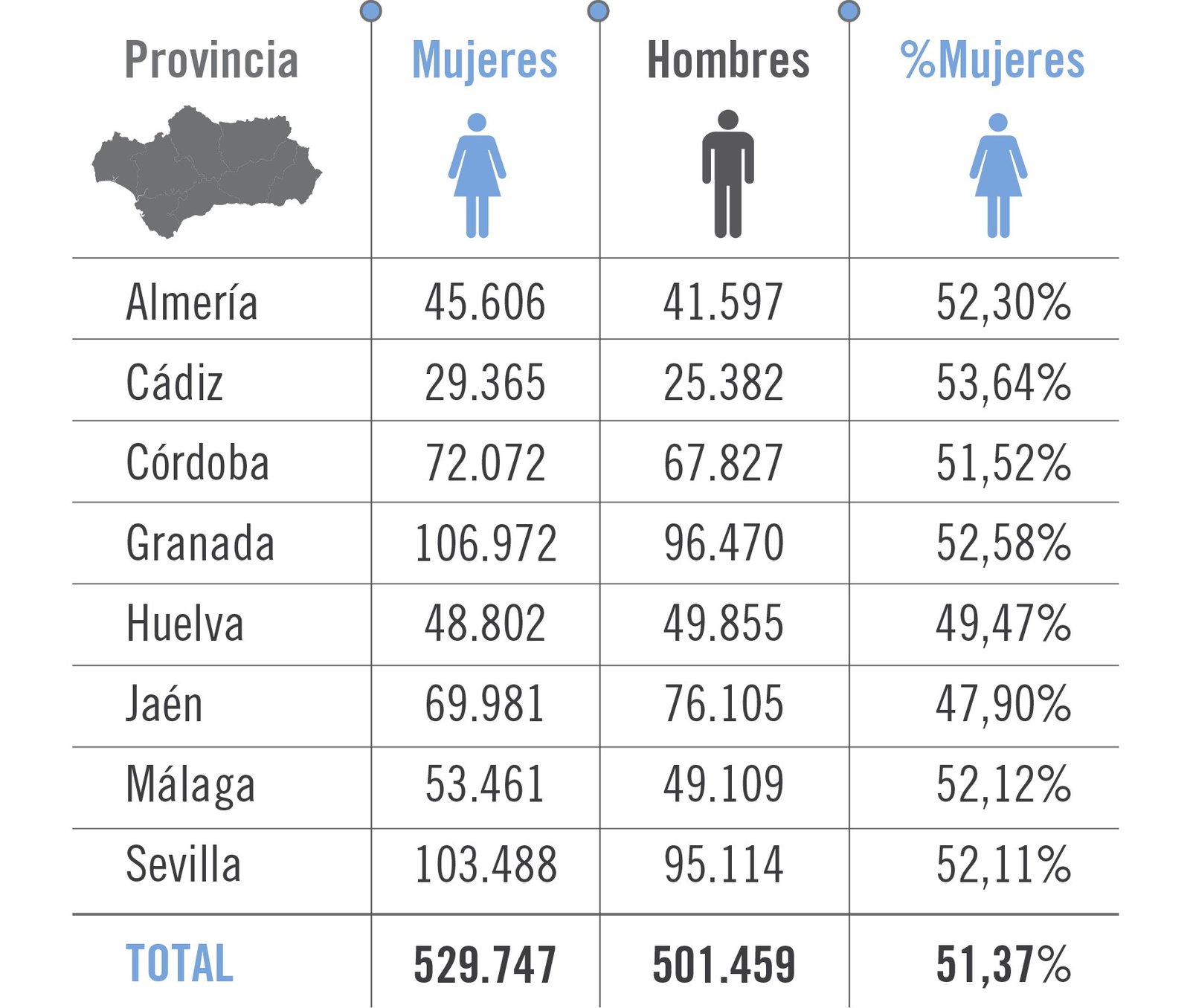 Además de tener una destacada presencia al frente de cada centro, las mujeres participan activamente y a diario en la red en pie de igualdad. Así, ellas constituyen más del 51,3% de las personas usuarias de los centros. Esta media se supera en 6 de las 8 provincias andaluzas, mientras que en las que el porcentaje de varones usuarios es mayor , las mujeres se mantienen en torno al 48%.