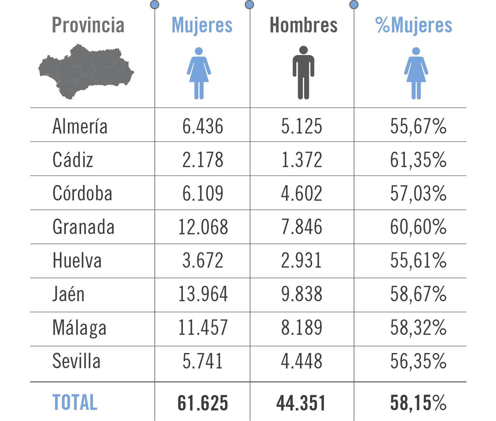 El porcentaje de mujeres al frente de los centros Guadalinfo supera el 60% en tres provincias andaluzas: Almería ( 62%), Granada ( 66,3%) y Huelva (64%). Las Agentes de Innovación Local suponen más de la mitad de la red de Agentes de Innovación Local en 6 de las ocho. Solo en Córdoba y Jaén el porcentaje de hombres es superior y en ambos casos la presencia femenina supera el 46% ( con el 49,06% Jaén y un 46,38% en Córdoba).