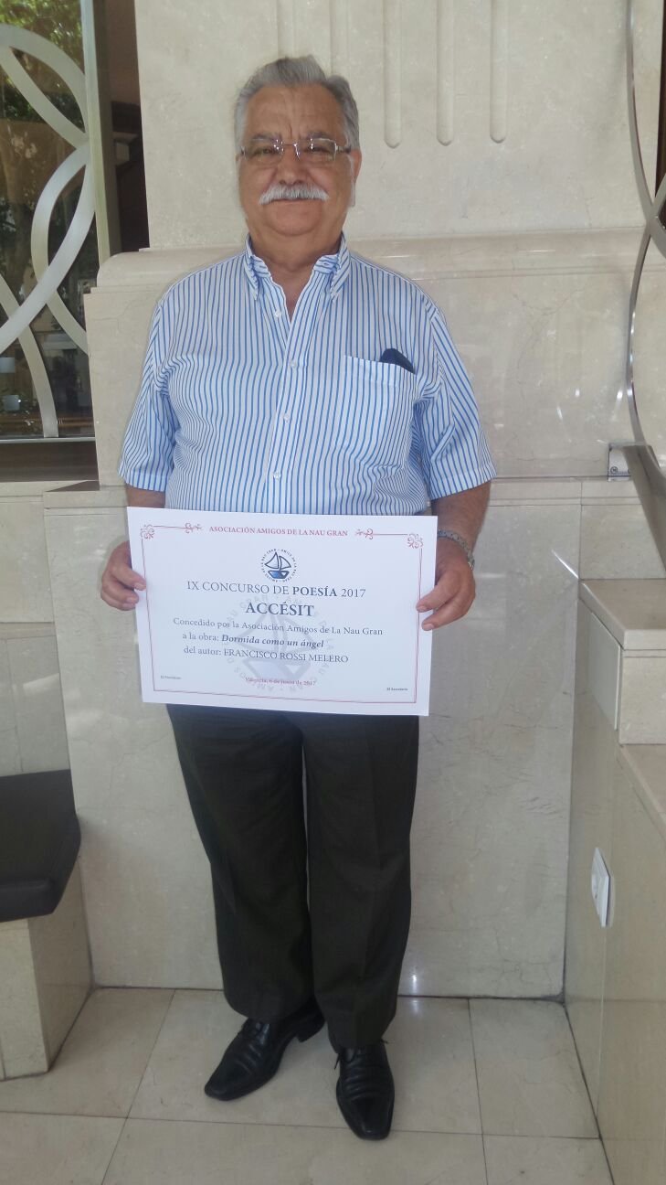 Nuestro socio y director adjunto en Valencia del periódico Granada Costa Proyecto Nacional, Francisco Rossi, recibió el día 6 de junio el accésit de poesía, en realidad un finalista, en el IX Concurso de Poesía 2017, concedido por la Asociación Amigos de la Nau Gran, Universidad de Valencia, por su obra “Dormida como un ángel”.