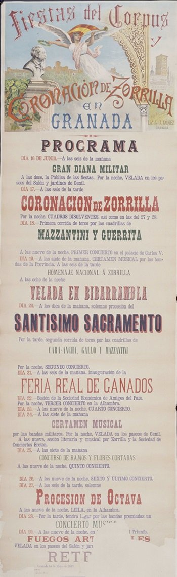 En el cartel anunciador de las fiestas del Corpus de aquel año. Buena parte de los actos estuvieron relacionados con la coronación de Zorrilla, incluso la corrida de toros que fue en homenaje suyo.