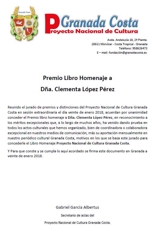 One thought on “Premio Libro Homenaje a Dña. Clementa López Pérez”