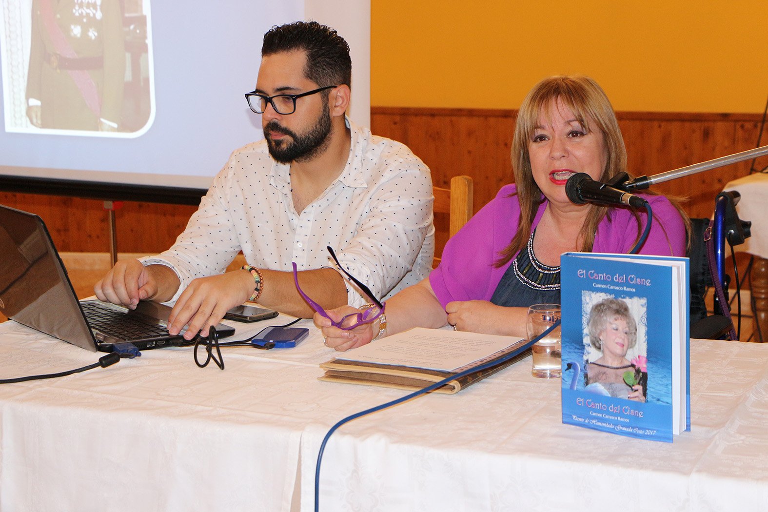 Segura también destacó de Carmen la gran labor que está haciendo como Delegada Nacional de Poesía, habiendo conseguido que el Rincón Poético del periódico Granada Costa Nacional pasara a más del doble de colaboradores de los que tenía anteriormente, pasando a hacer referencia a su dedicatoria que tiene en las páginas 8 y 9 del libro “El canto del cisne”: