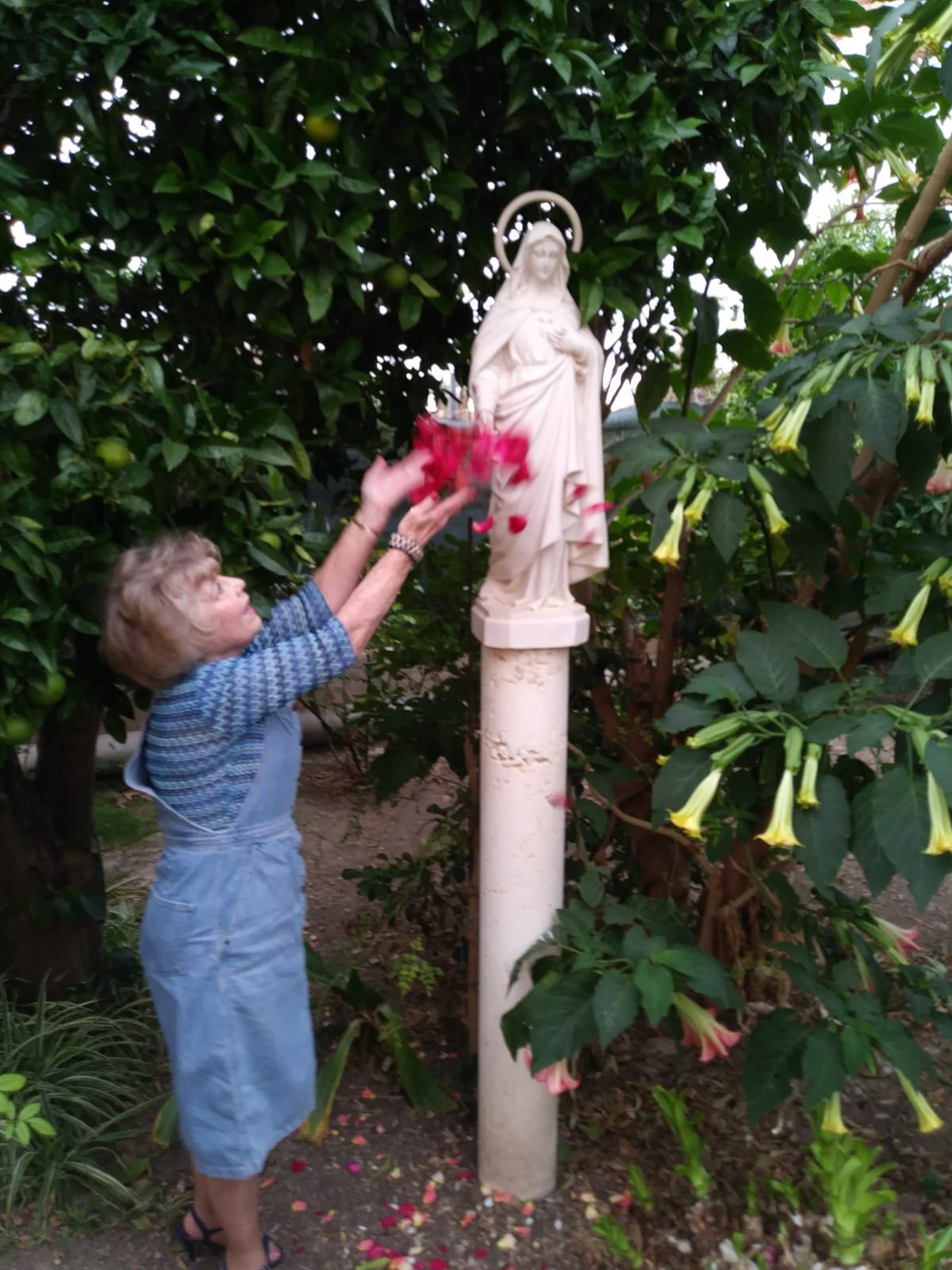 A las 12:00 en punto, como no podía ser de otra manera, en el jardín, delante de la Virgen María, se rezó el Ángelus, al tiempo que se le ofrecían pétalos de rosa a la Virgen. A continuación, se hizo una breve pausa para almorzar. Tras la comida, rápidamente se engalanaron los tres con la vestimenta de ceremonia.
