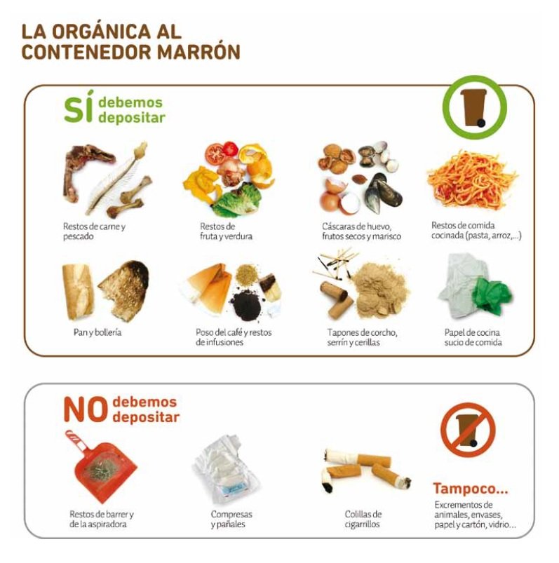 En el nuevo contenedor marrón se depositarán restos de alimentos (frutas, verduras, carnes, pescados), comida cocinada o en mal estado, cáscaras, pieles, huesos, o restos de infusiones, entre otros residuos. El contenedor marrón también acogerá restos de plantas y flores, hojas o césped en pequeñas cantidades.