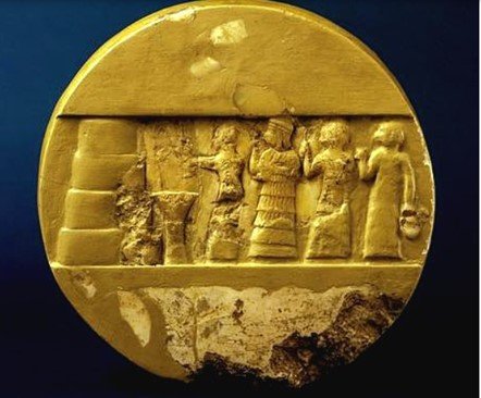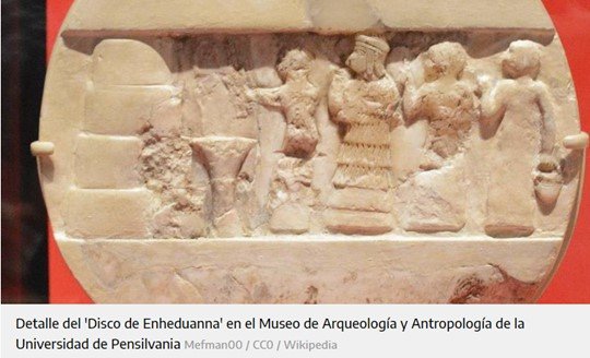 En los tres objetos encontrados aparece el nombre de Enheduanna, pero en el disco de alabastro hay figuras talladas. Una de esas figuras se ha identificado como la sacerdotisa Enheduanna, situada detrás de un sacerdote y por delante de un sirviente y un escriba. Aparece resaltada en tamaño para mostrar su importancia, luciendo un vestido de volantes y una diadema símbolo divino, de la que salen trenzas. Este disco fue datado entre los años 2000 a. C. y 1800 a. C., se encontró cerca de la estatua de una sacerdotisa, que probablemente fuese la propia Enheduanna. La inscripción grabada sobre en éste dice así: “Enheduanna, sacerdotisa-zirru, esposa del dios Nanna, hija de Sargón, rey del mundo, en el templo de la diosa Inanna.” (Klimczak, 2016). A la muerte de su padre, el rey Sargón I subió al trono su hermano Rimush y ella continuó como suma sacerdotisa. Durante la insurrección de Lugalanne que depuso a Rimush ella fue expulsada de Ur y, al recuperar su hermano el trono, regresó. Continuó en su cargo durante el reinado de su sobrino Naram-Sin. Durante esta época Enhedunna fue tan famosa que llegó a comparársele con la divinidad. Ella misma lo narra en su obra Nin-Me-Sar-Ra (Exaltación a Inanna) composición religiosa escrita en 153 versos en honor de la diosa sumeria Inanna, señora del amor y de la guerra, protectora de la ciudad de Uruk.